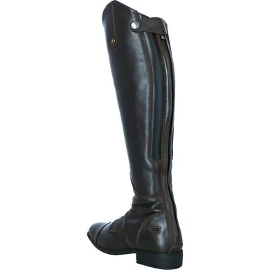 Elegante rijlaars van zacht, waterafstotend rundleder met een dikte van 1,6 -1,8 mm. De inzet aan de binnenkant van het been is vervaardigd van generfd leder voor extra grip. De laars heeft een voering van Dermo Dry met 3 mm foam. Dit materiaal is antibacterieel en vochtregulerend, zodat de voeten droog en fris blijven. De laars is voorzien van een sterke Optiยฎ rits (nr. 8) aan de achterzijde met een lederen ritsbeschermer met drukknoop aan de bovenkant. De rits loopt door tot aan de zool voor een makkelijke instap. Langs de rits bevindt zich een smalle inzet van rekbaar materiaal in lederlook. Deze stijlvolle inzet van Italiaanse kwaliteit zorgt voor een aansluitende pasvorm. De boog aan de buitenzijde van de knie is 5 cm hoog. Verder is de laars voorzien van een elastische vetersluiting en twee sporenknopjes. De profielzool van hoogwaardig natuurlijk rubber zorgt voor goede grip en de hak heeft uitstekende schokabsorberende eigenschappen. De tussenzool van het merk Texon is voorzien van een geรฏntegreerde metalen cambreur, die zorgt voor goede stabiliteit en een optimale drukverdeling. De toplaag van microfiber en 4 mm foam biedt extra comfort. De laars is slank gesneden rond de enkel en heeft een doorgestikte vierkante sierneus wat de optiek ten goede komt. Vervaardigd in Europa.
