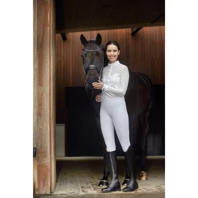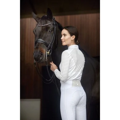 De CATAGO Phelina, is een elegant wedstrijdshirt gemaakt van een superstretch materiaal dat een vrouwelijke, stijlvolle en perfecte pasvorm biedt. De stretchstof zorgt voor meer bewegingsvrijheid in elke richting, waardoor het het perfecte shirt is voor paardrijden en wedstrijden. Ontworpen met gestreept effect en drukknopen langs kraag en borst. De metalen drukknopen verdwijnen als de kraag dichtgeklikt wordt. De kraag kan gesloten worden gedragen voor een formele look of open voor een meer casual uitstraling. Verkrijgbaar in zowel wit als zwart.