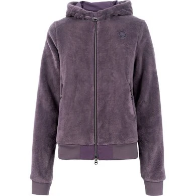 – Met gebreide manchetten van pluizig geweven bont.