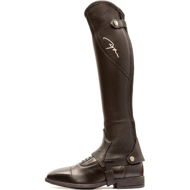 De Original halfchaps top in druppelvorm heeft een geborduurd Dyon-logo in crèmekleurig stiksel. In generfd leer, de bovenkant is zwart in de bruine en de zwarte versie.