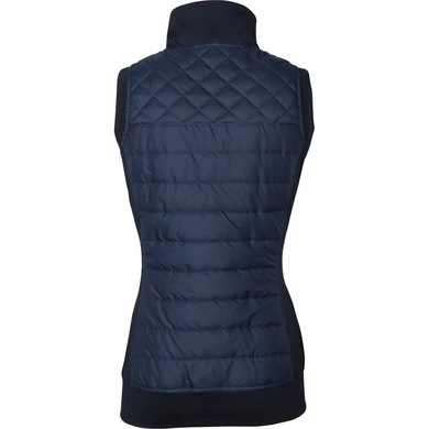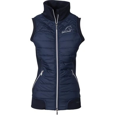 Sportieve bodywarmer met gewatteerde body en stretch zijpanelen, een zilverkleurige tweeweg ritssluiting en twee steekzakken met ritssluiting, Denici Cavalli logo op de borst. 100% polyester.