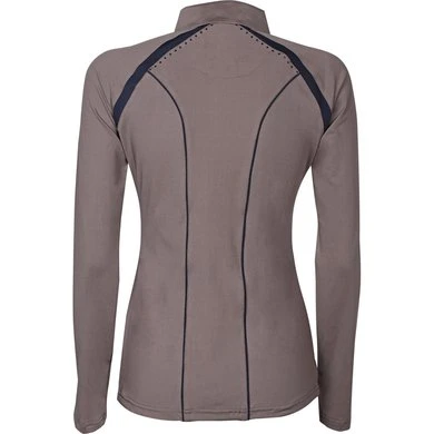 Shirt met lange mouw en opstaande kraag met een korte ritssluiting, navy halfronde panelen op voor- en achterzijde met navy kristallen ernaast, navy pipings op het achterpand, een Denici Cavalli print op de borst. 93% micropolyester / 7% elastan.