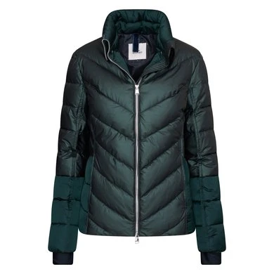 Vrouwelijk hip jasje met een extra hoge kraag die kan worden omgeslagen en vastgemaakt met drukknopen. De stijl is ontworpen met een rijke ton-sur-ton stoffenmix. Buisquilten in een diagonaal patroon. De stijl is afgewerkt met een luxe satijnen badge met glinsterende versiering bovenop.