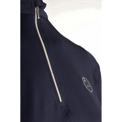 kraag. Aan de voorkant zit een zilveren nekrits en aan de linkerkant van de borst zit een montar-logo in heldere kristallen met een diameter van 4 cm. De perfecte polo voor je klassieke ruitergarderobe. De zeer functionele Mon-tech stof is ademend en zweetabsorberend, wat zorgt voor een comfortabel gevoel, zelfs als je hard werkt op je paard. Ook verkrijgbaar met korte mouwen.