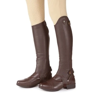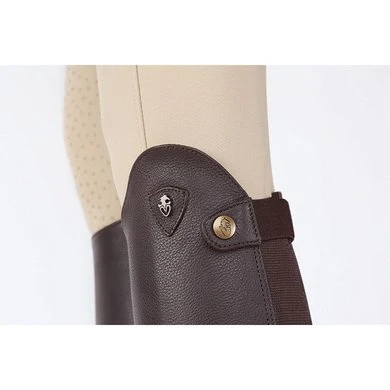 Beenkappen van zacht generfd leer om de slimme uitstraling van lange rijlaarzen te bereiken, maar met het comfort en de flexibiliteit van beenkappen. Elastische kuitpanelen aan de achterkant gecombineerd met zacht leer voor een aansluitende pasvorm die zich naar het been vormt, dressuurgesneden tops, ritssluitingen over de volledige lengte, elastische voetbeugels, elastische ritsen, nette banden, gebonden randen.