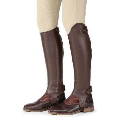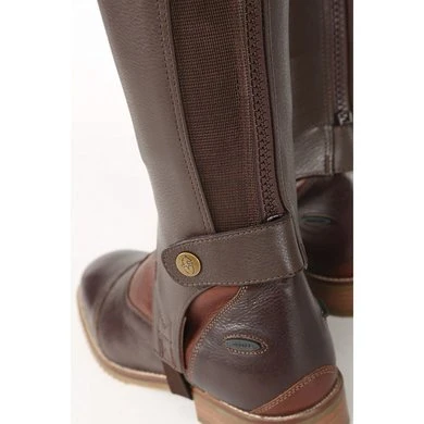 Beenkappen van zacht generfd leer om de slimme uitstraling van lange rijlaarzen te bereiken, maar met het comfort en de flexibiliteit van beenkappen. Elastische kuitpanelen aan de achterkant gecombineerd met zacht leer voor een aansluitende pasvorm die zich naar het been vormt, dressuurgesneden tops, ritssluitingen over de volledige lengte, elastische voetbeugels, elastische ritsen, nette banden, gebonden randen.