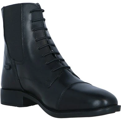 Jodhpurs van buffelleer met elastische veters, gevoerd met synthetische polyester wol. Ritssluiting aan de achterkant en elastische inzet. Buitenzool in TPR.