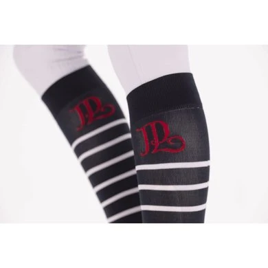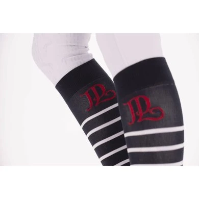 Pénélope “Duchesse” gestreepte sokken verkocht in sets van twee paar uit de Saint James x Pénélope Collections collectie. Deze set van twee paar sokken bestaat uit een navy gestreept wit paar en een navy gestreept wit paar. Beide hebben het PL logo in rood. Perfect om te dragen bij een paardrijbroek en ideaal voor vrijetijdsritten of wedstrijden. Samenstelling: 57,7% Polyamide – 27% Katoen – 11,7% Polyester – 4,5% elastaan: Kies je maat zonder je zorgen te maken, ze vallen niet groot of klein. Wasadvies: Onze Duchesse sokken kunnen zonder problemen in de wasmachine op 30°C gewassen worden. Droog ze echter niet in de droger.