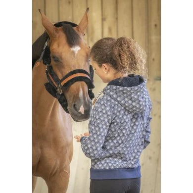 Gevoerde hoodie met patroon, witte bloemen op een zwarte achtergrond. Zwarte ritssluiting, zwart Pénélope-logo in het midden en twee steekzakkken. Machine wasbaar 30°C, niet in de droger. Samenstelling: 67% katoen en 33% polyester.