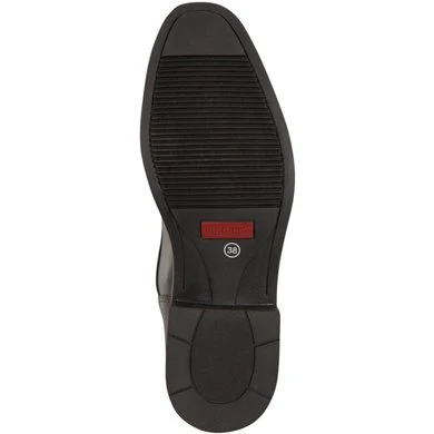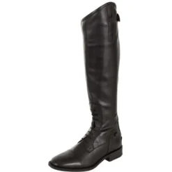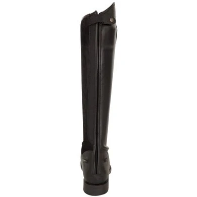 Elegante rijlaars van zacht, waterafstotend, glanzend synthetisch leder. De inzet aan de binnenkant van het been is vervaardigd van Suède voor extra grip. De laars heeft een voering van Spendex. Dit materiaal is elastisch en ademend, zodat de voeten droog en fris blijven. De laars is voorzien van een sterke YKK rits aan de achterzijde met een elastische ritsbeschermer met drukknoop aan de bovenkant. De rits loopt door tot aan de zool voor een makkelijke instap. Langs de rits bevindt zich een smalle inzet van elastiek voor een aansluitende pasvorm. De boog aan de buitenzijde van de knie is 4,5 cm hoog. Verder is de laars voorzien van een elastische vetersluiting en twee sporenknopjes. De profielzool van TPR rubber heeft een lichte glans en zorgt voor goede grip. De binnenzool is van Cellulose, deze is extra gelamineerd met een Membraam stof, dit materiaal is ademend en comfortabel. De laars is slank gesneden rond de enkel en heeft een doorgestikte vierkante sierneus wat de optiek ten goede komt.