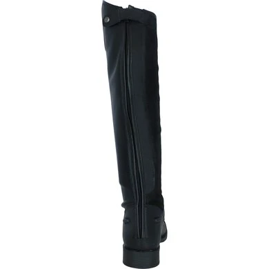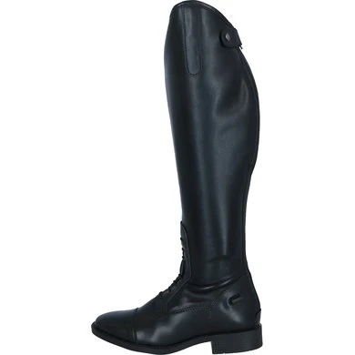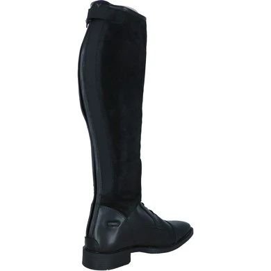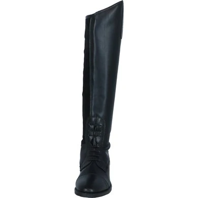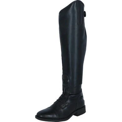 Elegante rijlaars van zacht, waterafstotend, glanzend synthetisch leder. De inzet aan de binnenkant van het been is vervaardigd van Suède voor extra grip. De laars heeft een voering van Spendex. Dit materiaal is elastisch en ademend, zodat de voeten droog en fris blijven. De laars is voorzien van een sterke YKK rits aan de achterzijde met een elastische ritsbeschermer met drukknoop aan de bovenkant. De rits loopt door tot aan de zool voor een makkelijke instap. Langs de rits bevindt zich een smalle inzet van elastiek voor een aansluitende pasvorm. De boog aan de buitenzijde van de knie is 4,5 cm hoog. Verder is de laars voorzien van een elastische vetersluiting en twee sporenknopjes. De profielzool van TPR rubber heeft een lichte glans en zorgt voor goede grip. De binnenzool is van Cellulose, deze is extra gelamineerd met een Membraam stof, dit materiaal is ademend en comfortabel. De laars is slank gesneden rond de enkel en heeft een doorgestikte vierkante sierneus wat de optiek ten goede komt.