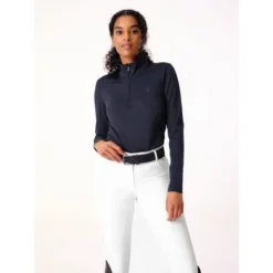 – Opstaande kraag met halve ritssluiting en logotrekker
