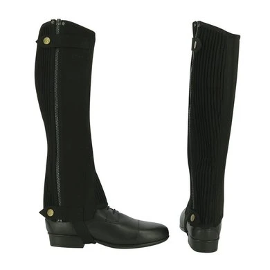 Mooi gevormde minichaps van amara (een heel sterk, fijn, soepel en wasbaar synthetisch materiaal: 65% nylon en 35% polyurethaan). Geribbelde, elastische inzetstukken op de wreef en op de achterkant van de kuit, bekleed met amara. Ritssluiting met boven en onder een lipje met drukknoop. Elastische zoolriem, verstevigd met amara.