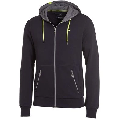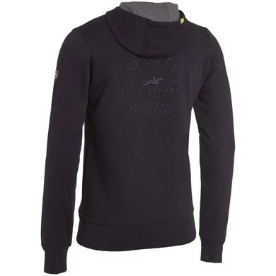 Met zijn extra zachte katoen is het heren sweatjack Collin van Schockemöhle Sports een comfortabele metgezel – zowel op stal als in het zadel. Twee kangoeroezakken met ritssluiting houden je handen warm en bieden ruimte voor je mobiele telefoon etc. De verstelbare capuchon heeft een contrastkleurige voering en is voorzien van een flaglabel. Gekleurde koorden, een geborduurd logo op de rug en ribband aan de halslijn ronden de sportieve look af.