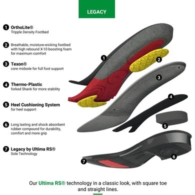 De LEGACY-serie biedt de ideale combinatie van klassieke uitstraling, comfort en kwaliteit. De rubberen zool, tussenzool met geรฏntegreerde polyamide gewrichtsondersteuning en EVA demping bieden ultieme ondersteuning, flexibiliteit en duurzaamheid, terwijl je meteen het gevoel hebt dat de schoen perfect is ingelopen. Prestaties van wereldklasse in een klassieke look en ontspannen comfort. Dit is precies wat onze LEGACY-serie u biedt. Met hieldemping en ORTHOLITEยฎ Triple Density-voetbed. Geniet de hele dag van comfort zonder in te leveren aan de klassieke look, duurzaamheid en veilige grip.